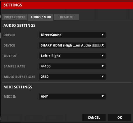 中央の「AUDIO/MIDI」タブが適切に設定されれば音が鳴ると思います。私の場合は、「DEVICE」の設定を変更したら音が出ました。「DRIVER」は「ASIO」が好ましいですが、先ずは音出しが重要ですね。