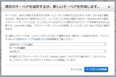 キーペアをまだ作っていない場合は上のメニューから新しいキーペアの作成を選んで名前を付けてダウンロード(.pem)します。私はクラウドストレージに置いています。他のデバイスからもダウンロードしやすいからです。