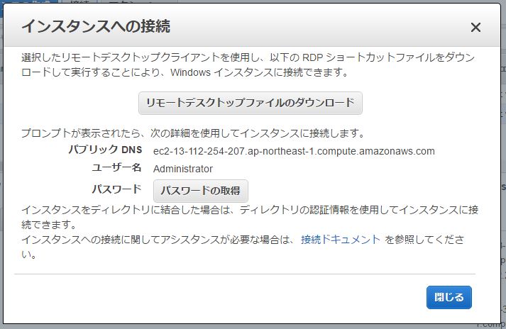 「Windowsパスワードの取得」をクリックし画面の指示に従ってパスワードを取得します。メモ帳などにコピーしておくと良いです。RDC(リモートデスクトップ接続)ソフトで最初にWindowsにログインする際に必要です。