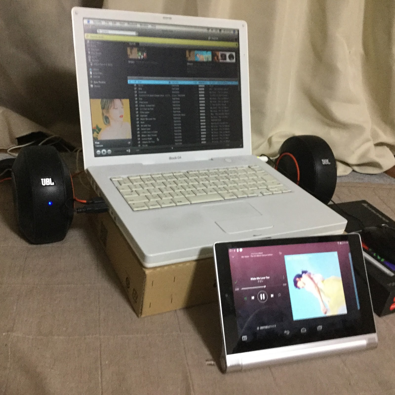 スピーカーは6,000円弱のJBL製「Pebbles」ですが、デスクトップのiBook G4に繋いで聴くと信じられないくらい良い音がします。USB1本で繋ぐフルデジタル処理なのでDSP処理に強いJBLならではのメリハリの効いた私好みの音です。