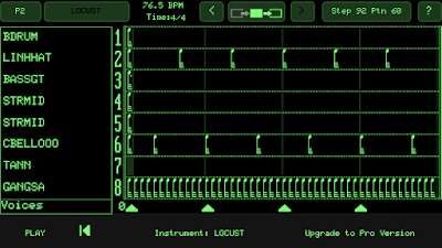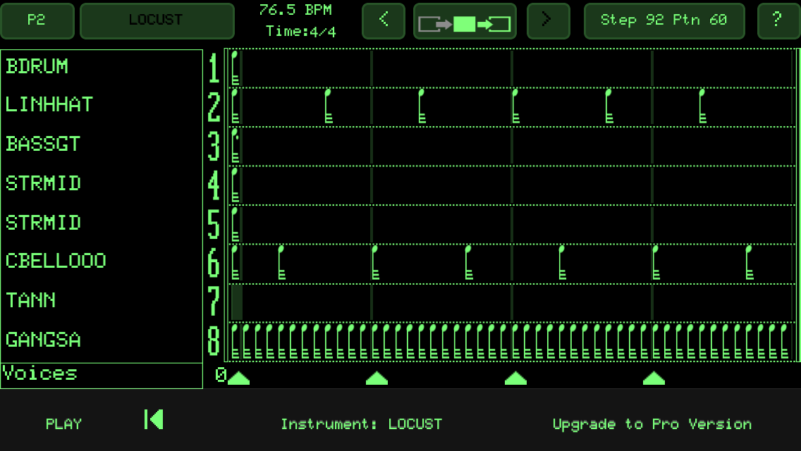 右上の表示で、92ステップ、60パターンによる演奏とわかります。1画面が1ステップです。つまり4/4で92小節の曲となります。さすがに自作するのはたいへんそうですが・・・