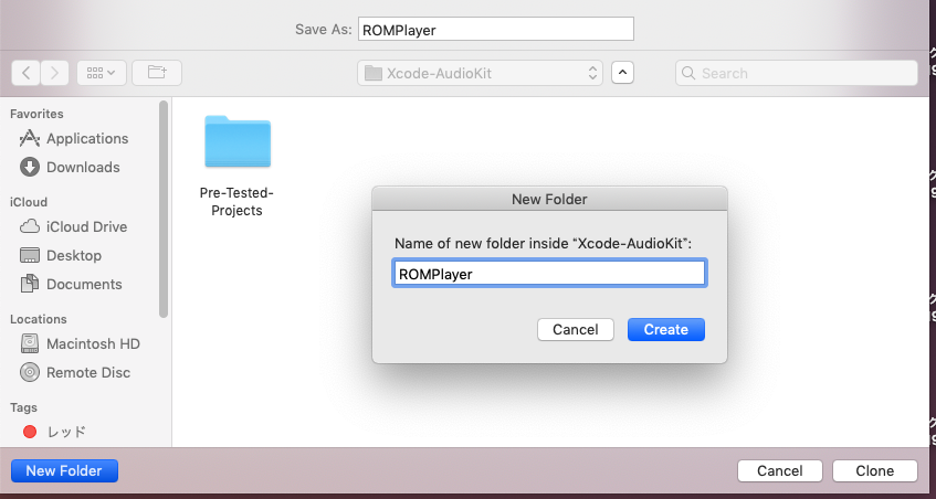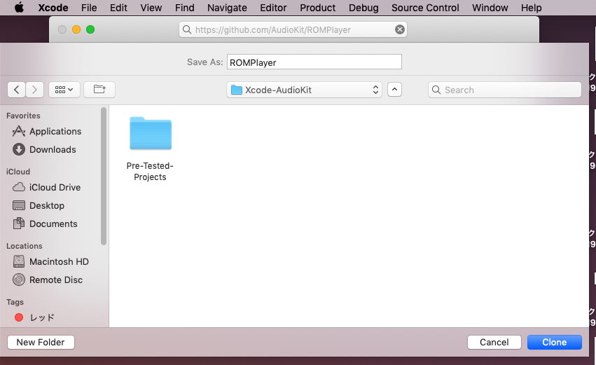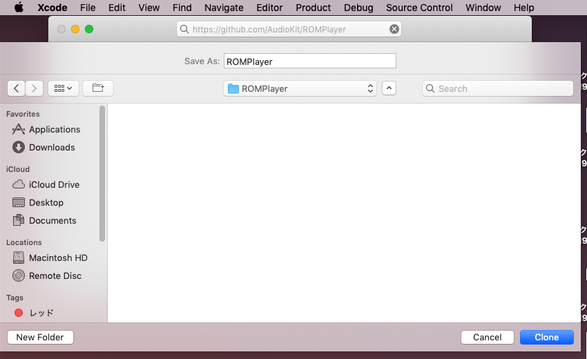 「Clone an existing project」をクリックし「ROMPlayer」のGitHubのURL(https://github.com/AudioKit/ROMPlayer)をコピーしてトップのアドレス窓に貼り付けます。