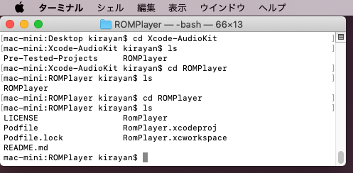 「ROMPlayer」フォルダーは2階層あるので、lsコマンドで「Podfile」ファイルがあるフォルダーまで移動したのを確認。