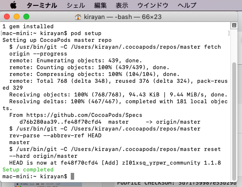 「pod setup」 + return を実行。