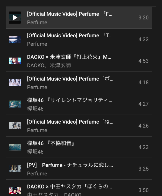 従来はYouTubeでPerfumeを聴くのはライブがメインでしたが、先ずはミュージックビデオを聴いてみました。「Perfume」で検索します。
