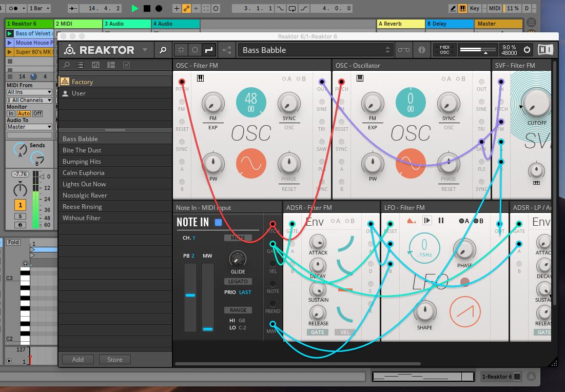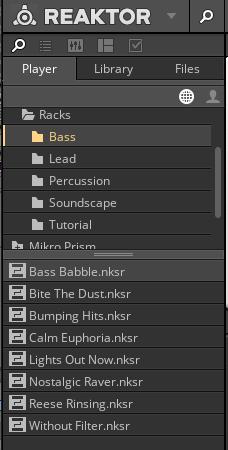 REAKTORのBassフォルダーを選んで、とりあえずトップの「Bass Babble.nksr」をステージ上にドラッグアンドドロップして開きます。