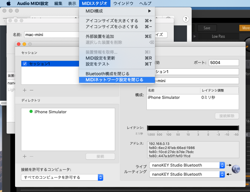キーポイントは上記の「MIDIネットワーク設定…」メニューで開く画面の右下にある「ライブ」と「ルーティング」で「nanoKEY Studio Bluetooth」を選ぶ事です。